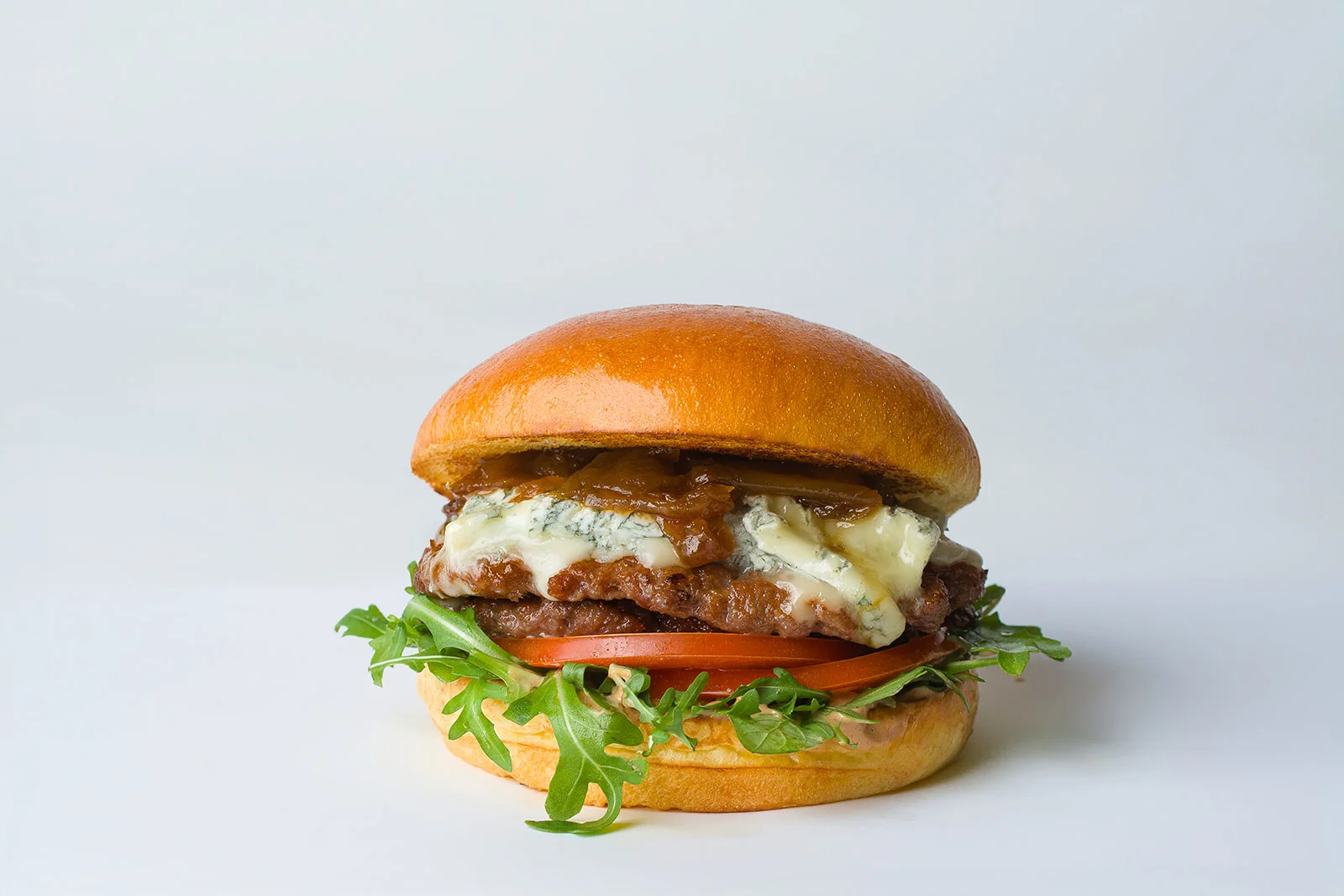 Carn smash 100 % de vedella en pa brioche, amb formatge blau fos, ceba caramelitzada, rúcula fresca i maionesa. Per a paladars que busquen un perfil més intens i complex.
